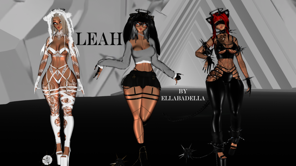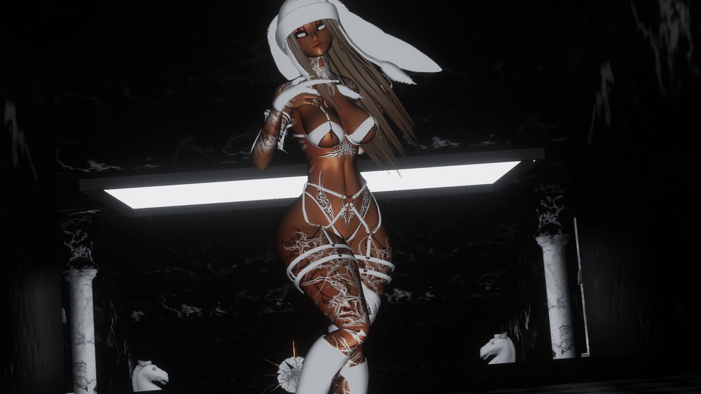 Tops ( Long Sleeve, Top, Bra, Bodysuit and Corset ) Bottoms ( Skirt, Panties, and Pants ) Shoes ( Boots and Heels ) Accessories ( Leg Warmers, Leg Wraps, Garter, Arm Wraps, Cuffs, Gloves, Tail, Wings and Ankle Chain ) 3 Hair Swaps ( Wavy, Staright, and Bun also can go bald hehe ) 7 Hair Color Swaps Head Accessories ( Horns, 2 Hats, Halo, Glasses, Blindfold and Kitty Ears ) Clothes Matswap from white to black Metal swap Silver to Gold 4 Texture Swaps Face Jewlery Index Finger and DPS